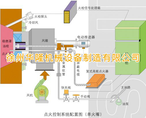 本系統由就地點火控制柜(SKDK)、高能點火裝置、火焰檢測裝置、油燃燒器推進執行器和球閥組成。點火柜按用戶要求可以采用繼電器或可編程控制器PLC為核心。系統可自動(接受集控室指令)或手動(現場就地)控制。點火設備按有關規范及設定程序進行鍋爐的點火操作,并給出各種工況的就在顯示和對集控室的信號反饋。